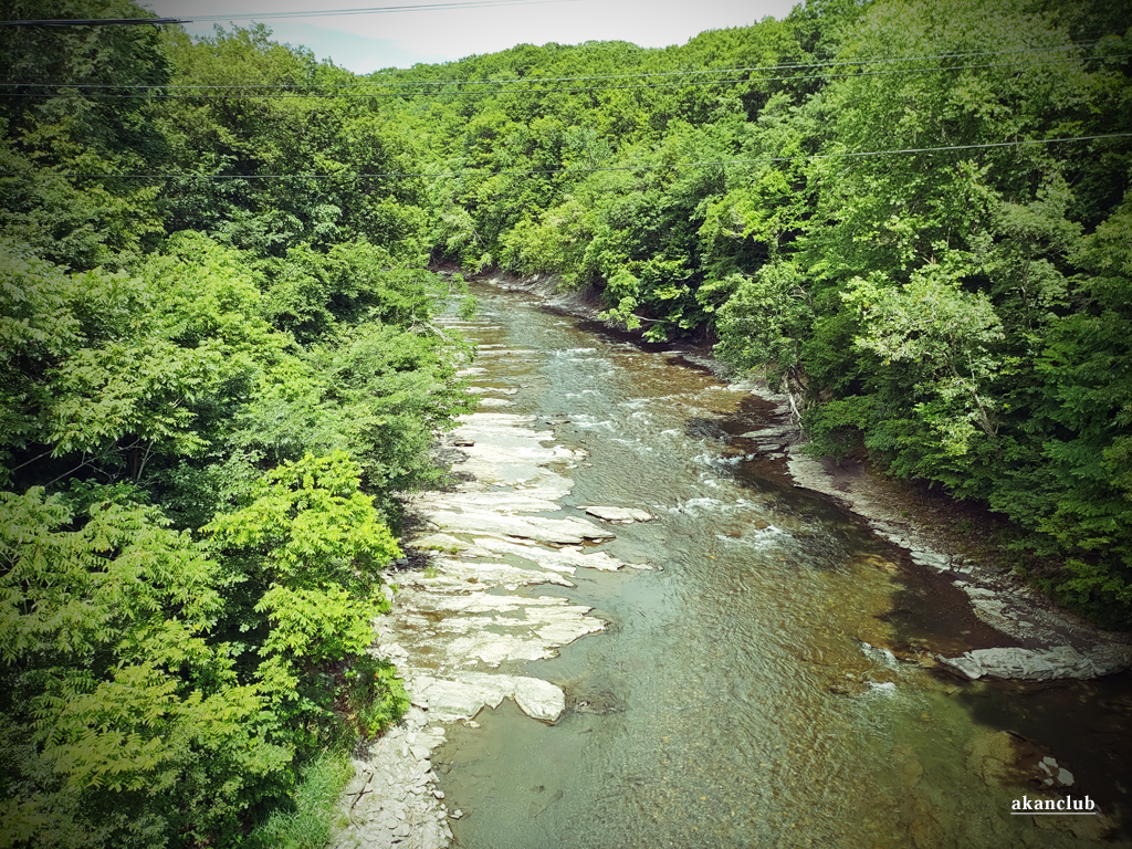 鎮橋から見下ろした川は渇水で岩盤が目立つが、木々に囲まれた自然は昔のままで迎えてくれました。