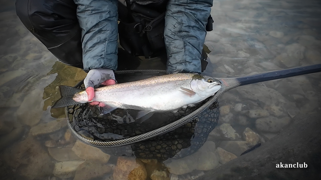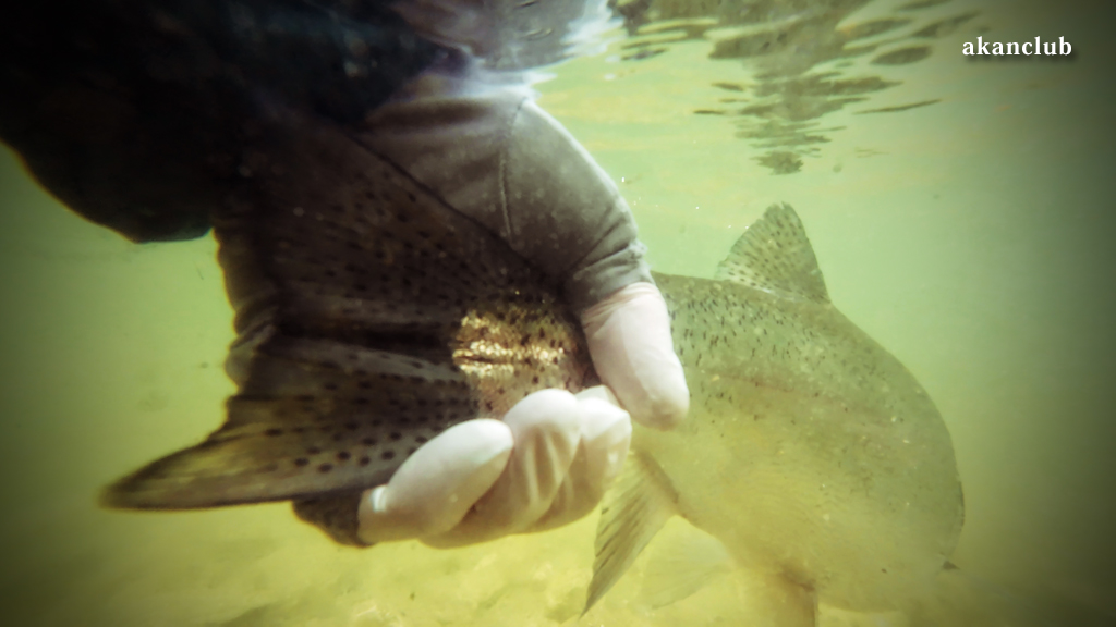 ネットインした鱒を岸に持ち込んでリリースシーンを撮影しました。